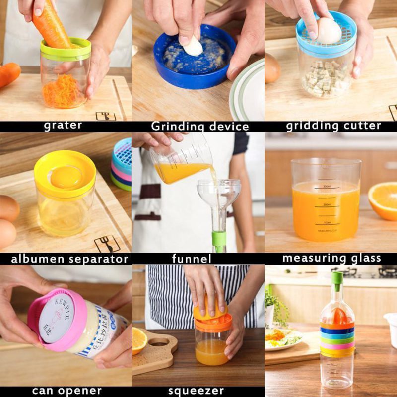 Bottle Kit-Eight-in-One Cue! This handy utensil is actually eight utensils packed into one bottle storage container! Everything you could possibly need is at your fingertips, including a funnel, juicer, grater, egg cracker, shredder, can opener, egg separator and measuring cup. All instruments neatly placed inside the container are colored differently for easy identification. (Amazing Kitchen)