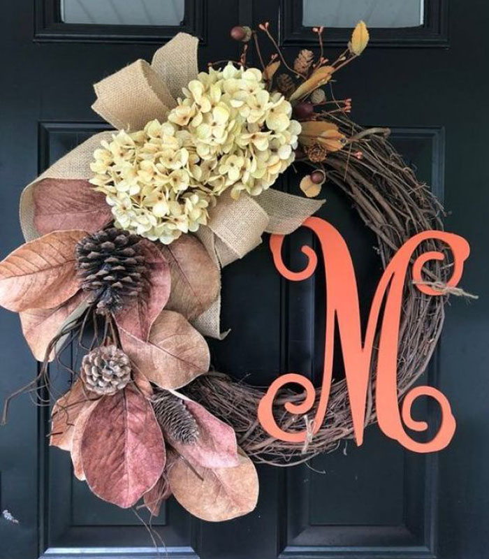 Making a Monogram wreath at home is easy. Leaves and flowers can be elegantly made using DIY tips. Attach them to the wreath and hang the well-designed Halloween wreath on your door.