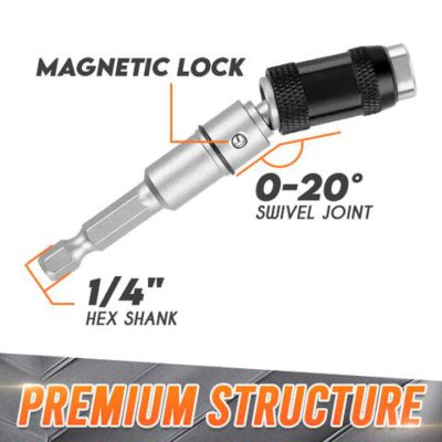 Great bit holder. The articulation is great for anything that is not straight on. The magnet works more than well enough to hold in a bit and now it can be pulled out by hand easily. The locking slide works great and once popped in either direction (aligned, or not aligned) locks in there.