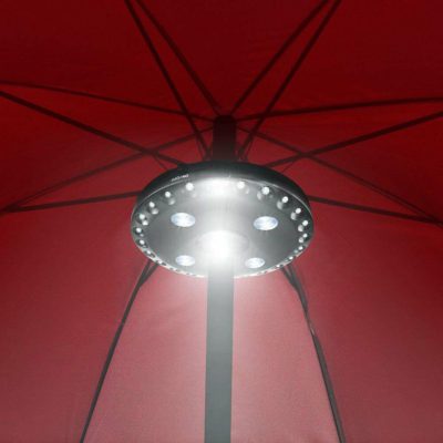 This light is very bright if you face the LEDs toward the table. And it gently illuminates the underside of a patio umbrella if the LEDs are faced up and at its highest power. Holds well to a wooden umbrella pole and is very easy to operate the latch that allows you to remove or install the light onto the pole. Batteries last a good long time in this light. Highly recommended.