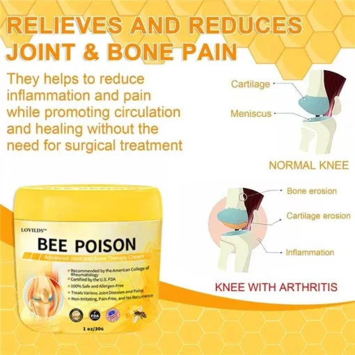 LOVILDSβ’ Bee Poison Advanced Joint and Bone Therapy Cream contains six proven, powerful ingredients that have been used to effectively treat arthritis and bone-related conditions in millions of people around the world.