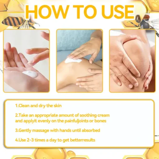 ๐๐๐๐๐ยฎ cream contains natural bee venom, which effectively improves joint flexibility. The active compound โbee venom peptideโ deeply penetrates the joints, alleviating stiffness and discomfort caused by inflammation and helping to restore joint mobility. Over time, the anti-inflammatory effects of bee venom continue to promote synovial fluid production, providing better lubrication for the joints, reducing friction, and significantly improving joint flexibility within 7 days.