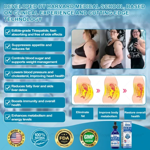 The key ingredient inย Tooyesโข Tirzepatide GLP-1 Herbal Oral Liquid, theย oral Tirzepatide, was meticulously developed by a team ofย endocrinology and metabolism expertsย fromย Harvard Medical School. With overย 15 years of research experienceย inย weight lossย andย metabolic management, the team is dedicated to exploring the most advanced treatment methods, resulting in thisย revolutionary product.