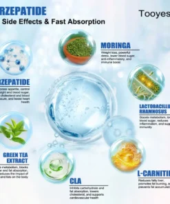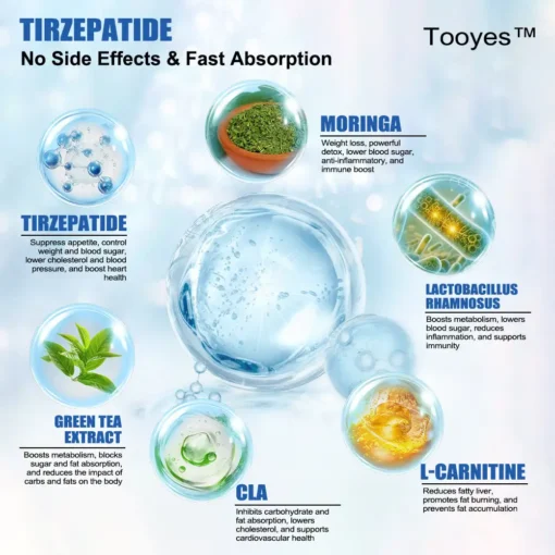 Ingredients:ย Tirzepatide๏ผMoringa๏ผL-Carnitine๏ผLactobacillus rhamnosus๏ผCLA๏ผGreen Tea Extract๏ผApple Cider Vinegar