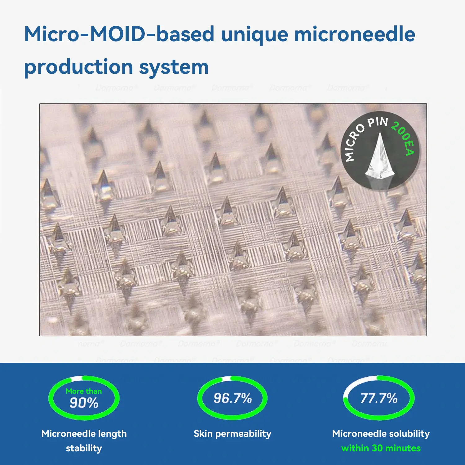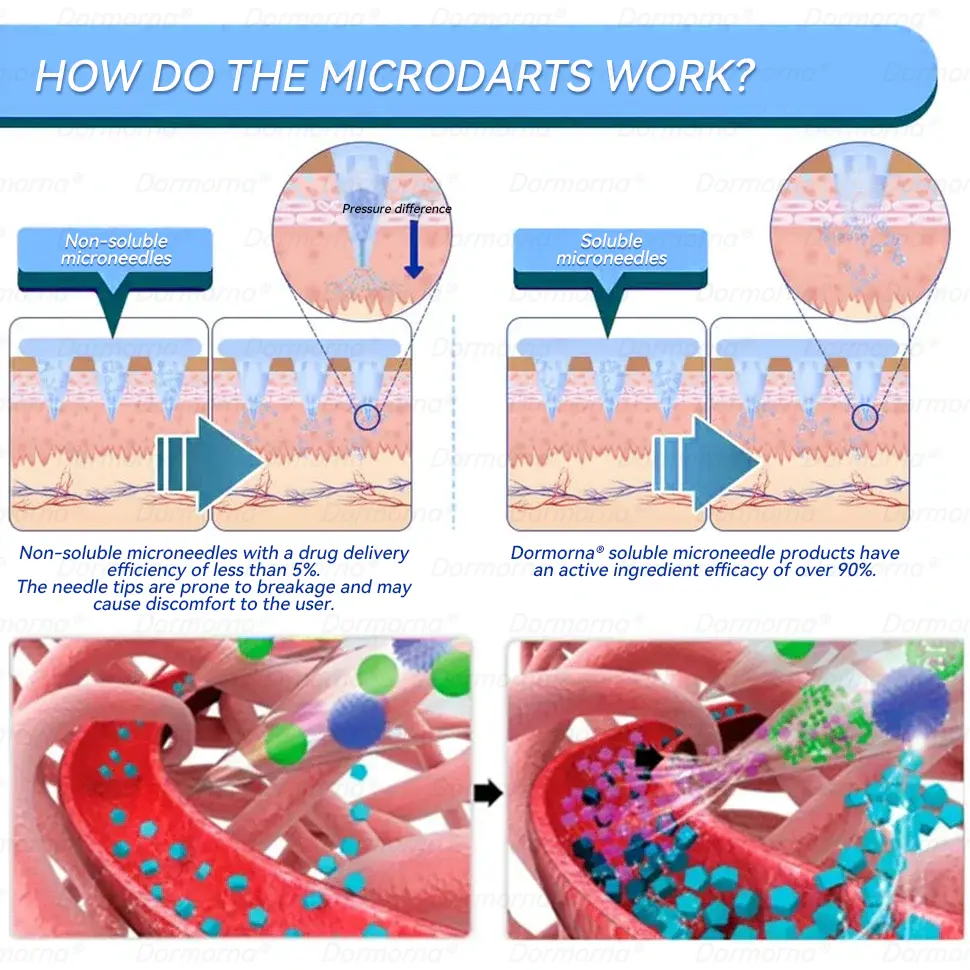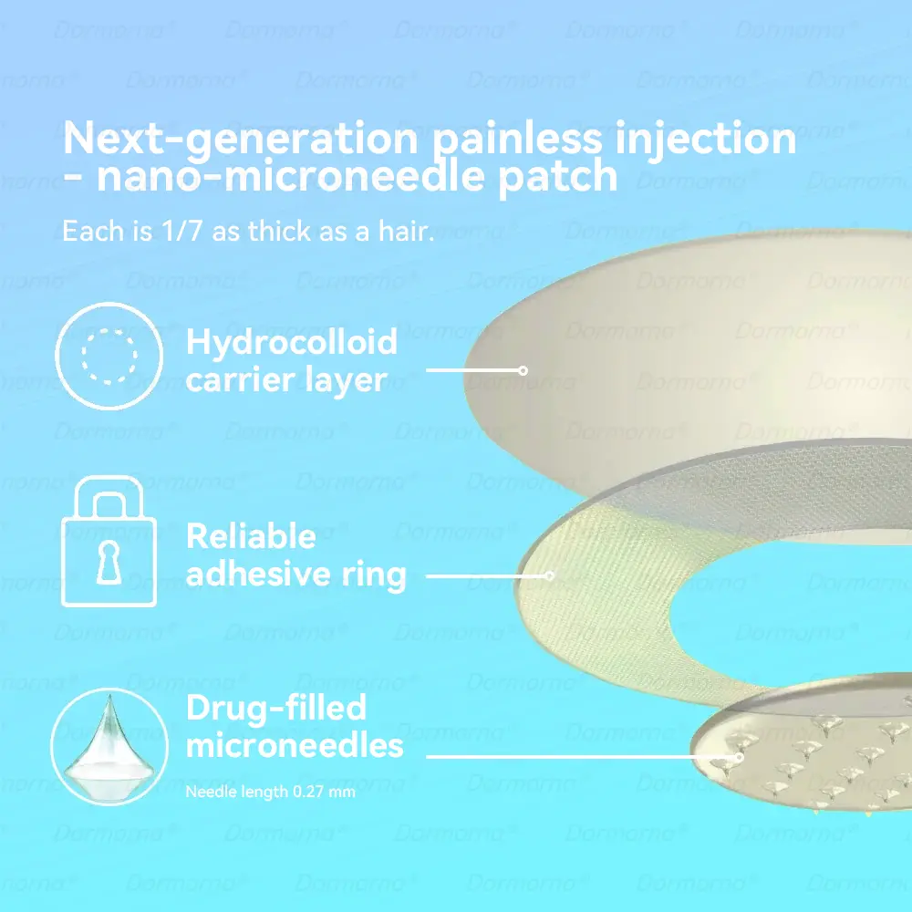 Each needle isย 0.27 mmย long, onlyย 1/7 the thickness of a hairย , and containsย soluble medicationย .ย These microneedles are precision-engineered using state-of-the-art manufacturing techniques to ensure a seamless, pain-free experience while effectively delivering the active ingredients directly into the skin.