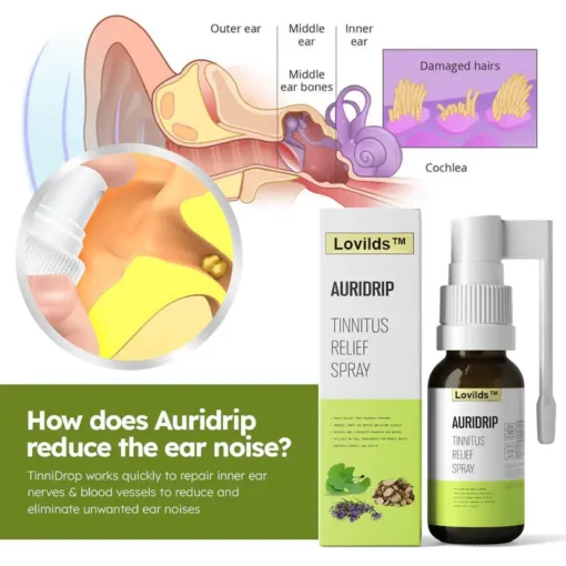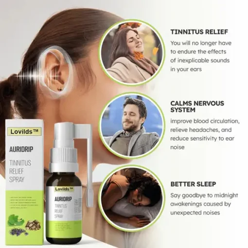 Lovildsβ’ Auridrip Tinnitus Relief Spray is an all-natural solution designed to reduce symptoms likeΒ ringing,Β buzzing, and other related discomforts. It targets the root causes of tinnitus and helps soothe theΒ emotionalΒ andΒ physicalΒ burden of the condition, giving you peace of mind.