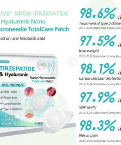 This nano-microneedle patch uses advanced Tirzepatide technology to precisely deliver active ingredients deep into the skin. It scientifically regulates insulin secretion, inhibits glucagon, delays gastric emptying, and assists in controlling blood sugar levels, thereby promoting healthy fat loss and optimizing overall health management. At the same time, Hyaluronic and Matrixyl 3000ย can also stimulate skin regeneration and improve skin firmness, allowing users to maintain tight and smooth skin while losing weight.