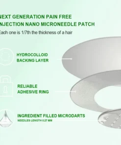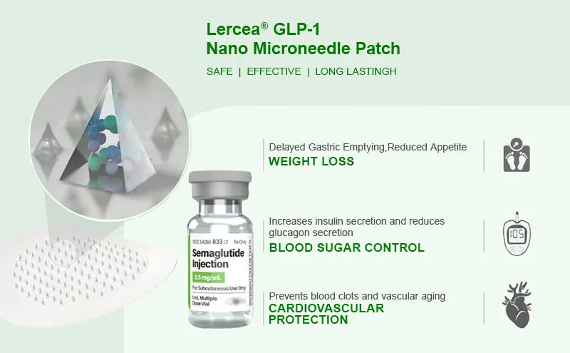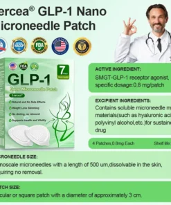 The Nano Microneedle Patch contains SMGT-GLP-1 in each patch. It works by mimicking the action of Glucagon-like Peptide-1 (GLP-1), promoting insulin secretion, inhibiting glucagon secretion, and delaying gastric emptying, which helps control blood sugar levels and aids in weight loss.