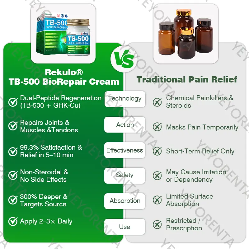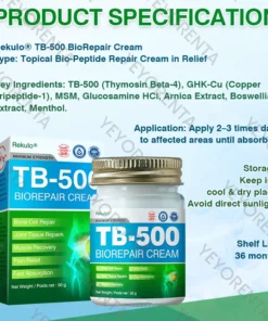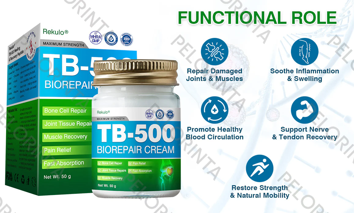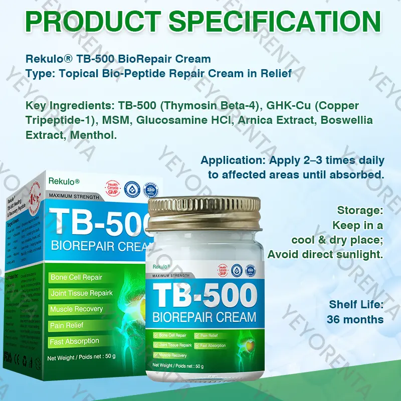 We bring you a revolutionary and clinically formulated solution โย Rekuloยฎ TB-500 BioRepair Cream! This advanced peptide-based therapy combines TB-500 (Thymosin Beta-4) and GHK-Cu Copper Tripeptide-1 to target joint pain, inflammation, and muscle or tendon damage at the source. With its medical-grade transdermal delivery system, it penetrates deeply to promote cellular repair, ease swelling, and restore natural flexibility and movement. With no pills, no injections, and no surgery required, Rekuloยฎ delivers fast comfort within minutes and supports lasting regeneration โ helping you move freely again and feel your body come back to life.