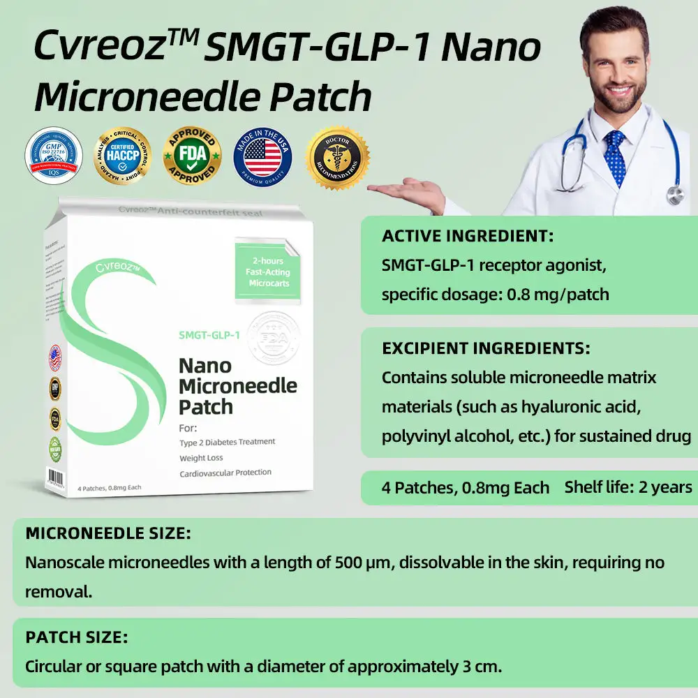 The Nano Microneedle Patch contains SMGT-GLP-1 in each patch. It works by mimicking the action of Glucagon-like Peptide-1 (GLP-1), promoting insulin secretion, inhibiting glucagon secretion, and delaying gastric emptying, which helps control blood sugar levels and aids in weight loss.