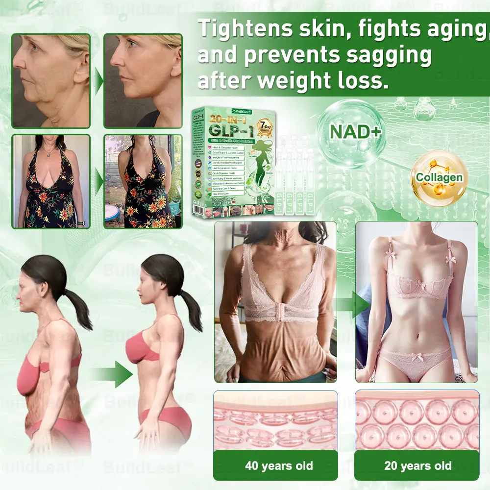 Collagen peptides strengthen skin structure, reduce fine lines, and improve elasticity. NAD+/NMN promote cellular repair and collagen synthesis, while Omega-3 helps lock in moisture and enhance smoothness. Green tea extract, turmeric, and moringa leaf extract are rich in powerful antioxidants and anti-inflammatory compounds that protect the skin from oxidative stress and environmental damage, helping slow down the aging process. Magnesium supports skin repair and hydration balance, while silymarin provides detoxifying effects to brighten the complexion. This synergistic formula effectively improves sagging skin, smooths wrinkles, delivers anti-aging benefits, and restores firmness and a youthful appearance after weight loss.