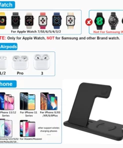 Charging stand holder Universal Desktop Charging Stand 30 degree Ergonomic Design allows users to charge mobile phone. The wireless charging pad supports charging your iWatch, iPhone and Airpods simultaneously and in one place.