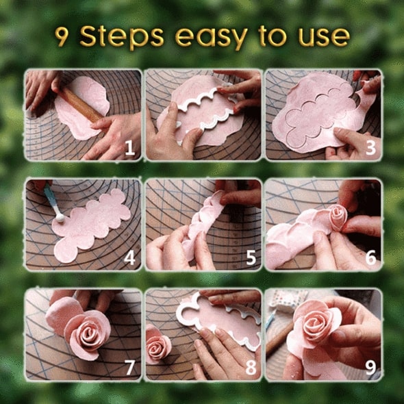 3 Easy Steps. Press, fold & roll! Press the cutter on the fondant and wipe water or edible glue on the flower. Fold the two edges up and here comes the final part, Roll the fondant from one edge to the other. Easy!