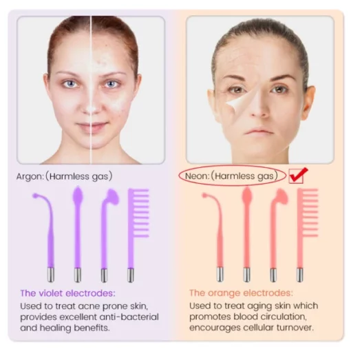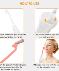The orange glowing wand is designed to brighten aging skin. It creates a natural warmth that targets fine lines and wrinkles and promotes cell renewal. The energy flow produces enriched oxygen molecules to reduce microbes that cause blemishes and blackheads. Electrotherapy helps to soften your acne by stimulating blood flow and improving circulation.