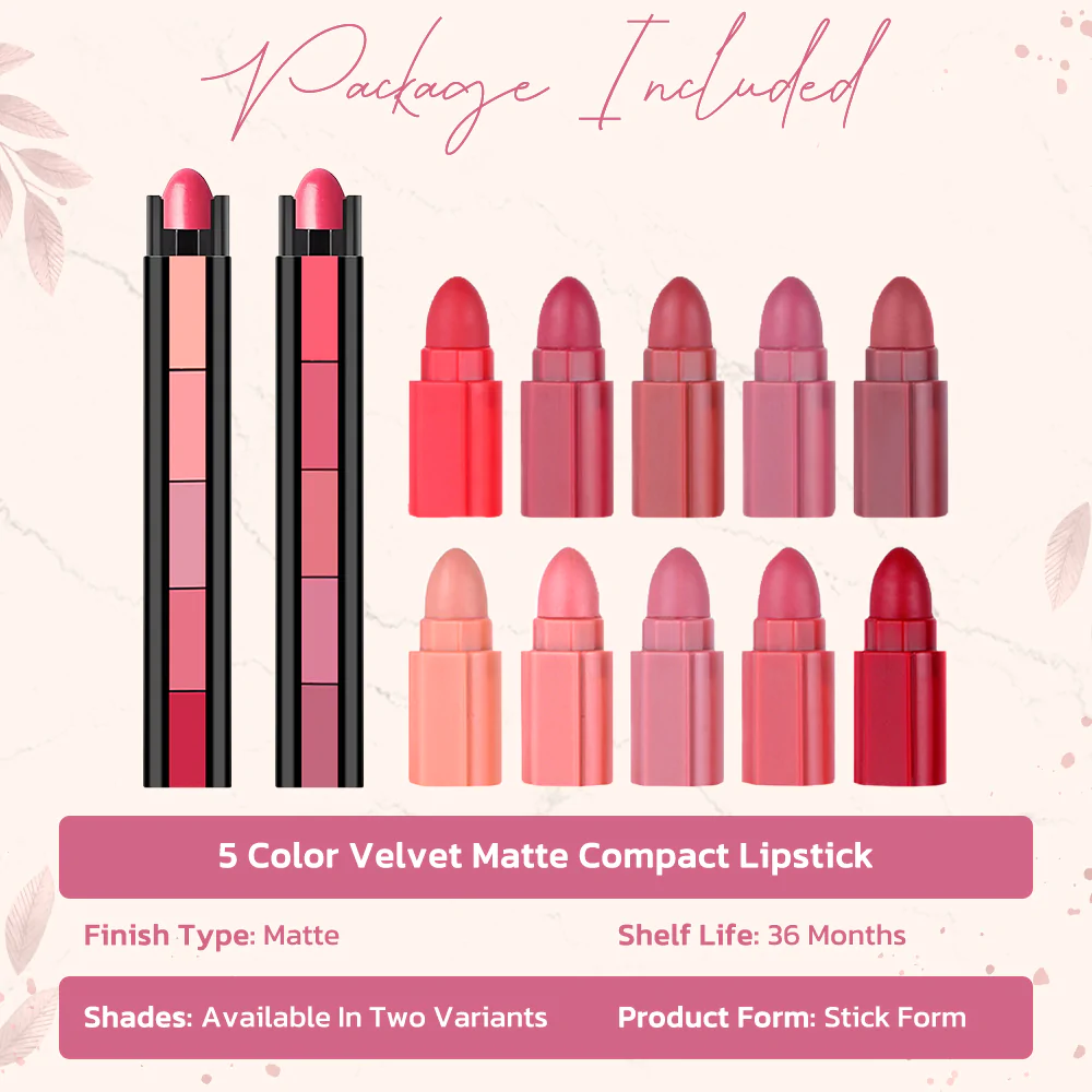 - Package: 1 x 5 Color Velvet Matte Compact Lipstick