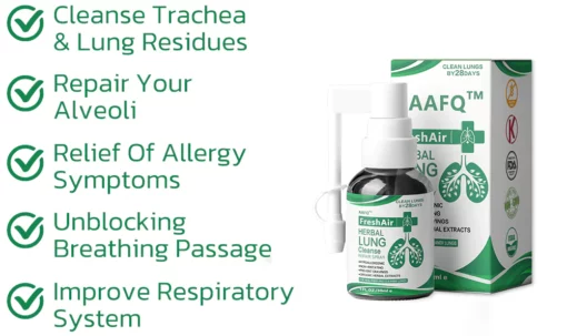 The AAFQ™ FreshAir Herbal Lung Cleanse Repair Spray works by utilizing its unique design and natural plant extracts. When applied to the skin, it absorbs the extracts to alleviate stress-induced allergies and support respiratory health. It reduces allergy symptoms and helps eliminate waste and excess mucus from the lungs, improving lung function.