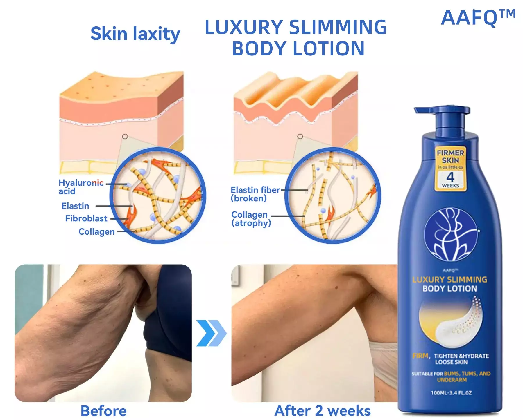 Clinical studies show that AAFQ™ LUXURY SLIMMING BODY LOTION can tighten loose skin in 98.5% of users within 3 weeks. This improvement includes restoring skin elasticity, firming sagging areas, evening out skin tone, and enhancing overall skin texture.