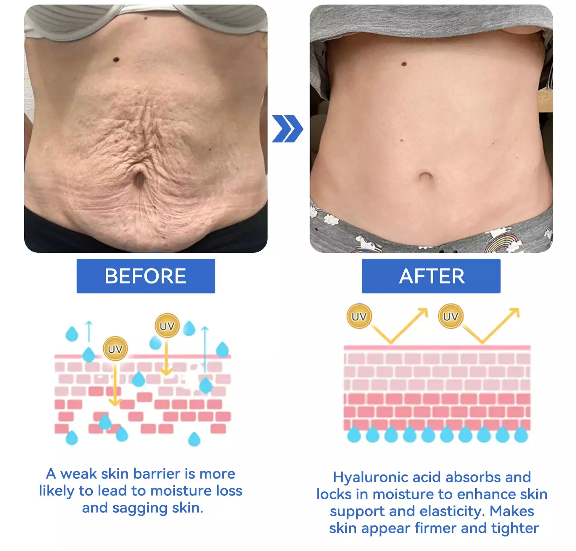 Loose skin, also known as skin laxity, can lead to sagging, wrinkles, dryness, and uneven texture. This is often caused by the natural aging process or rapid weight changes, which stretch the skin and weaken its elasticity. Clinical research by the American Academy of Dermatology shows that AAFQ™ LUXURY SLIMMING BODY LOTION can visibly improve skin laxity within 3 to 5 days, with over 180,000 satisfied users, 98.5% of whom report positive results.