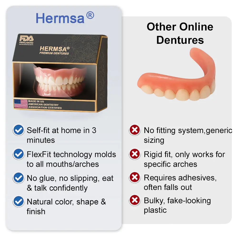 Hermsa® AdaptableFit Premium Dentures are the closest at-home system we’ve seen to clinical-grade custom fitting. Its gel layer protects the alveolar ridge, promotes natural pressure distribution, and improves oral function over time.”