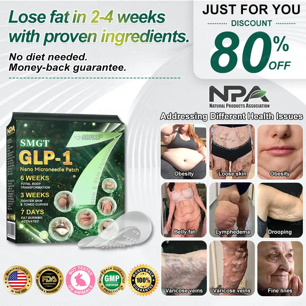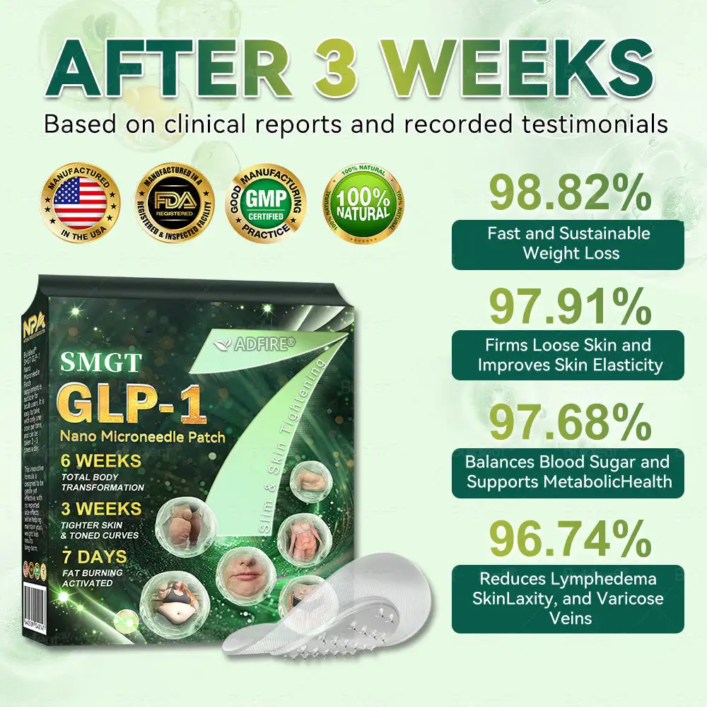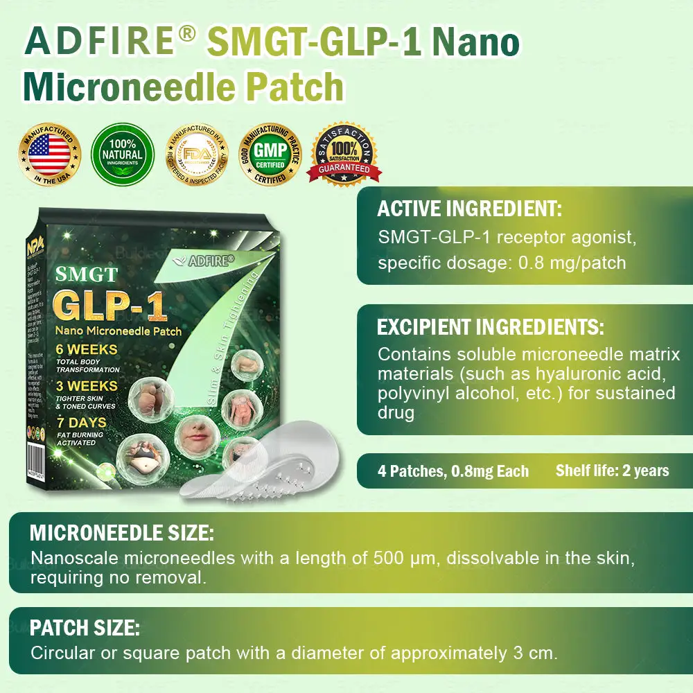 The ADFIRE® SMGT-GLP-1 Nano Microneedle Patch boosts GLP-1 activity to support healthy blood sugar. appetite control. and weight management. It delivers SMGT-GLP-1. a GLP-1 receptor agonist that mimics the natural hormone—stimulating insulin. suppressing glucagon. and reducing hunger.