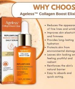 Ageless™ Collagen Boost Elixir operates through a combination of scientifically-supported active ingredients that target the underlying causes of aging skin. The formula is designed to penetrate the dermal layer and provide essential nutrients and hydration to the skin. It works synergistically to provide multiple benefits to the skin, including the reduction of the appearance of fine lines and wrinkles, improvement in skin elasticity and firmness, hydration, and protection from environmental damage.