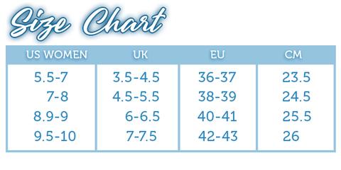 | Size | Women US 5.5-7, Women US 7-8, Women US 8.5-9, Women US 9.5-10, Men US 5-6, Men US 6.5-7.5, Men US 8-9, Men US 9.5-10 |