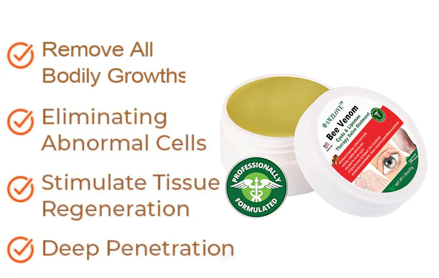 Awzlove™ Bee Venom Cysts & Lipomas Therapy Salve Ointment utilizes the powerful properties of bee venom and salicylic acid to provide a solution that directly kills abnormal skin cells. It disrupts key cellular processes, triggering apoptosis and halting cell division, while protecting surrounding healthy cells. This targeted cell-killing mechanism addresses the root cause and reduces or eliminates problematic skin growth. Enriched with active ingredients derived from bee venom, this advanced formula dissolves and subtly eliminates undesirable growths.