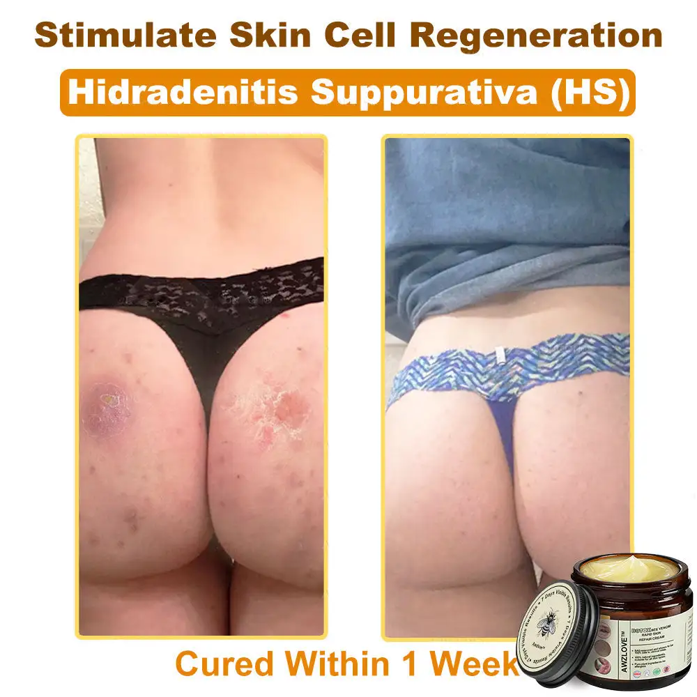 “Dealing with Hidradenitis suppurativa has been such a painful experience, especially with those red, swollen lumps that make sitting so uncomfortable. I tried everything—meds, oils, sprays—but nothing really worked. I was ready to settle for managing it long-term until I found this cream. It eased the pain fast, and after just three days, the swelling went down a lot. The dark patches have lightened up, and my skin feels so much smoother, not thickened anymore. Now, it’s almost completely cleared up, and I feel so much relief!”