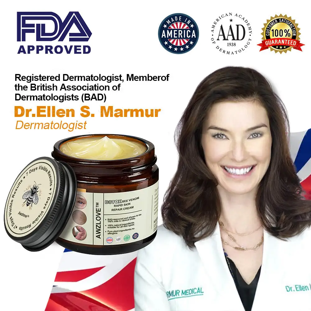 “As a dermatologist, I’ve always been passionate about finding effective, natural solutions for skin problems. After extensive research and testing with my lab team, and clinical trials involving over 2,000 participants, I discovered that bee venom is a powerful natural ingredient for addressing a wide range of skin concerns. This led me to create the Awzlove™ Botox Bee Venom Rapid Skin Repair Cream—an all-in-one solution designed to naturally and effectively relieve multiple skin issues with precision.” – Dr.Ellen Marmur, MD. Dermatologist