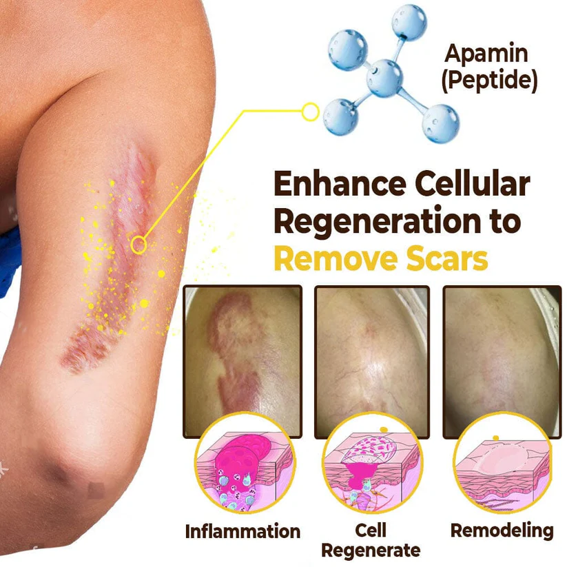 Infused with potent enzymes and active compounds, this advanced formula works by significantly reducing inflammation and boosting collagen production. Regular use of CicatrixCare can diminish the appearance of scars, leaving your skin looking clearer and more rejuvenated. Diminishes inflammation in scar tissue, a crucial process since extended inflammation can result in more severe and persistent scars. The primary component of Bee poison, Melittin, possesses potent anti-inflammatory and antimicrobial properties. By alleviating the inflammatory response, the spray effectively reduces the swelling and redness commonly linked to scars.