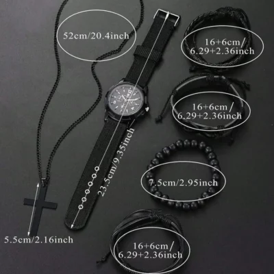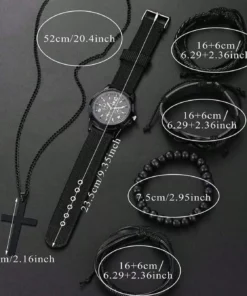 6pcs_Set Fashionable Pu Leather ‘8’ Shape Beaded Bracelet With Mechanical Watch, Cross Pendant Necklace For Men, Black-Colored