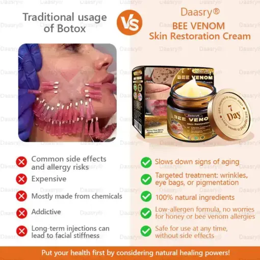 ✅ Scientifically Formulated: The formula of Daasry® Bee Venom Skin Restoration Cream is scientifically developed to maximize its effectiveness in promoting skin rejuvenation and enhancing your overall appearance.