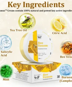 The flysmus™ Bee Venom Treatment Cream provides an effective solution by harnessing the powerful properties of bee venom to target a range of skin imperfections, such as eczema, acne, rosacea, fungal Infections, warts, skin cancer, blemishes, and even conditions like psoriasis. Packed with active ingredients from bee venom, this advanced formula gently dissolves and eliminates unwanted growths, while also offering anti-inflammatory benefits to help soothe the skin.