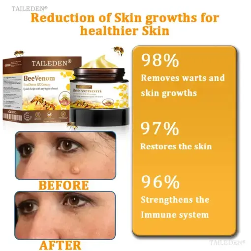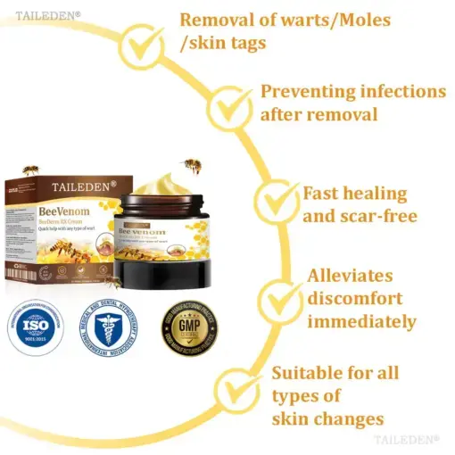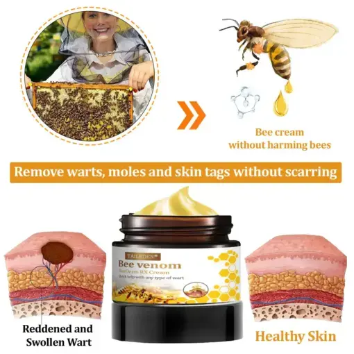 Bee venom not only removes skin tags and warts but also actively supports the skin’s natural healing process