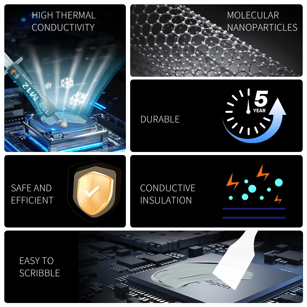 M12 thermally conductive silicone grease is formed by nano-molecular technology, in the process of use can be high-density filling of metal gaps and reduce thermal resistance, so that the M12 in the process of heat conduction is more fluent, and quickly improve the effect of heat dissipation.