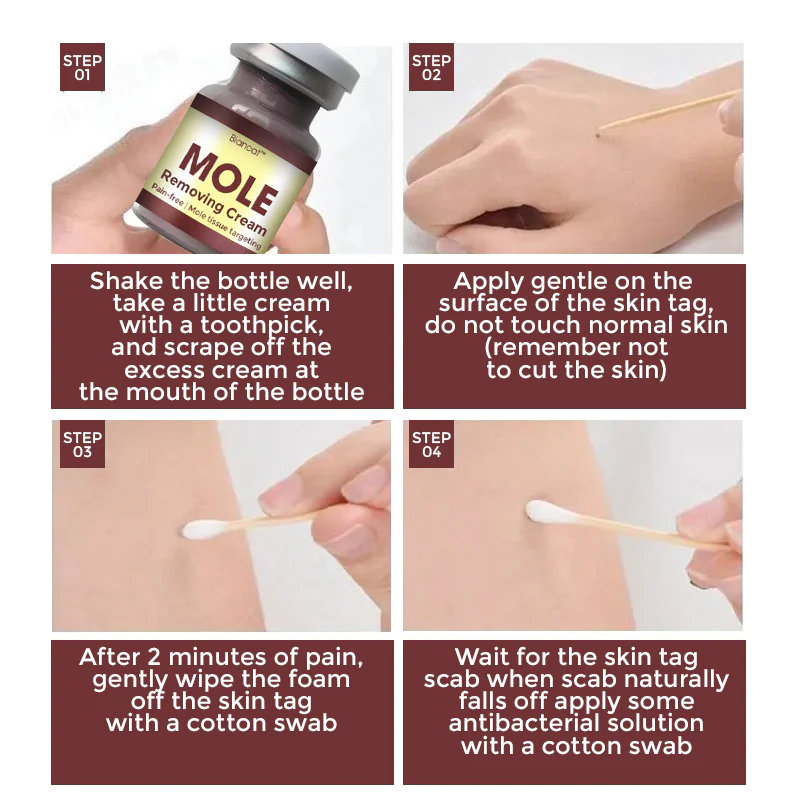 Say goodbye to the hassles of surgical interventions and harsh treatments. Biancat™ ClearDot Mole Removal Serum empowers you to effortlessly handle moles, on both your face and body, all while enjoying the comforts of your own home.