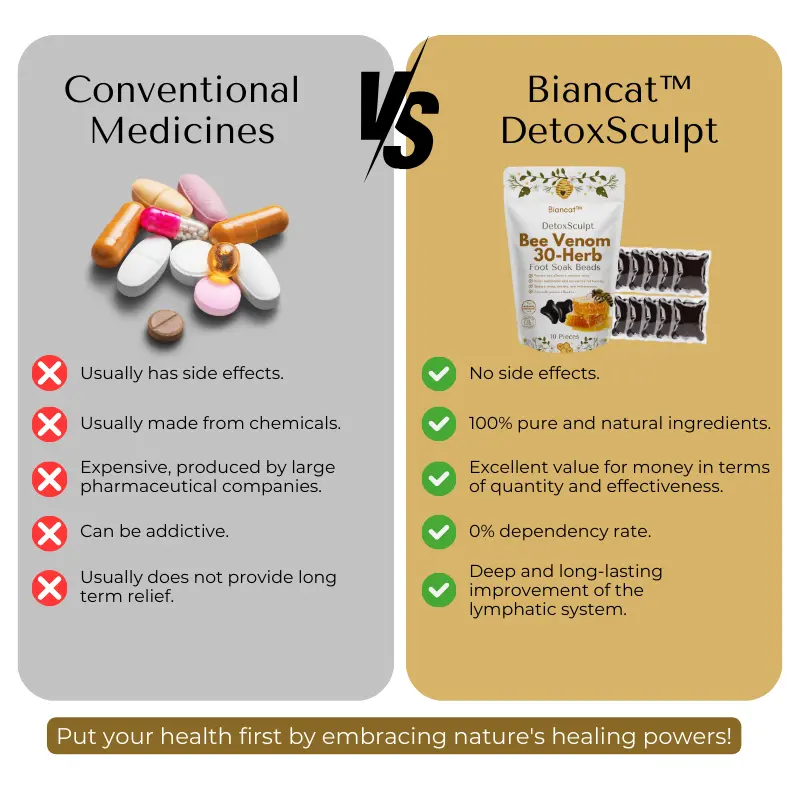 The Biancat™ DetoxSculpt Bee Venom & 30-Herb Foot Soak Beads offer a natural, holistic approach to enhancing your wellness routine. Infused with powerful ingredients like bee venom, royal jelly, and a unique blend of 30 handpicked herbs, this product targets a range of concerns, from detoxification to body sculpting. Whether you want to relieve swelling, manage varicose veins, improve circulation, or boost overall vitality, these foot soak beads promise to deliver visible results in as little as 3-6 weeks.