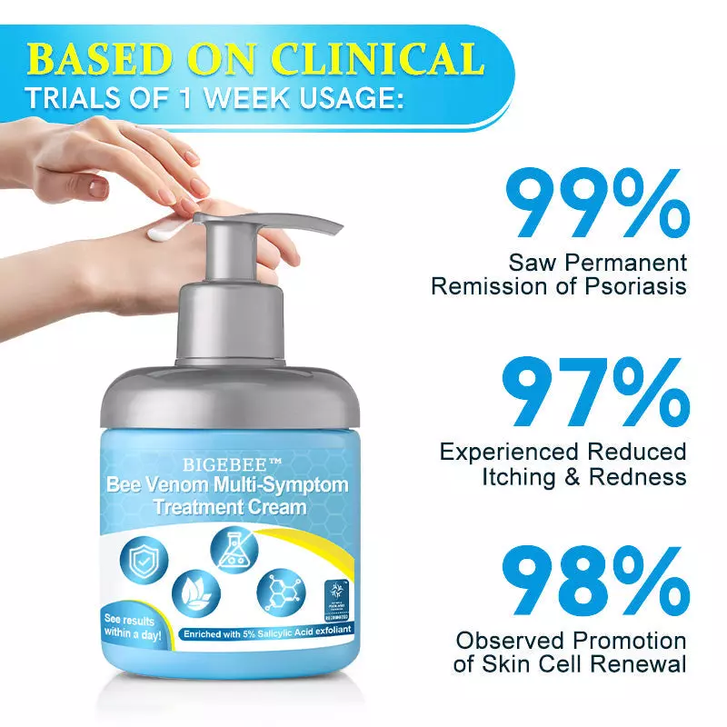 Discover the 𝘽𝙞𝙜𝙚𝙗𝙚𝙚™ Bee Venom Multi-Symptom Treatment Cream—a scientifically formulated solution for psoriasis relief. This powerful cream helps alleviate itching, reduce flaking, calm redness, and promote healthy skin regeneration. Experience a visible difference in just days as it balances your immune system, reduces inflammation, and restores moisture to your skin.
