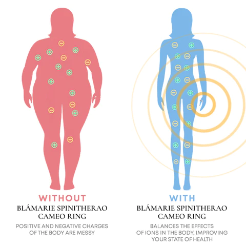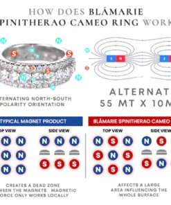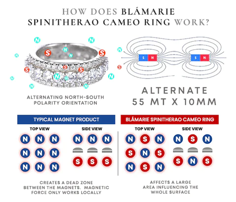 Typical magnetic products either use magnets with minimal magnetic field penetration or cause like poles to repel each other, creating a dead zone between magnets. The Blámarie SpiniTherao CAMEO Ring uses Alternating North-South Polarity Orientation to maximize magnetic field flux, while also releasing electromagnetic charge to clear blockages in the body and restore a natural flow of energy.