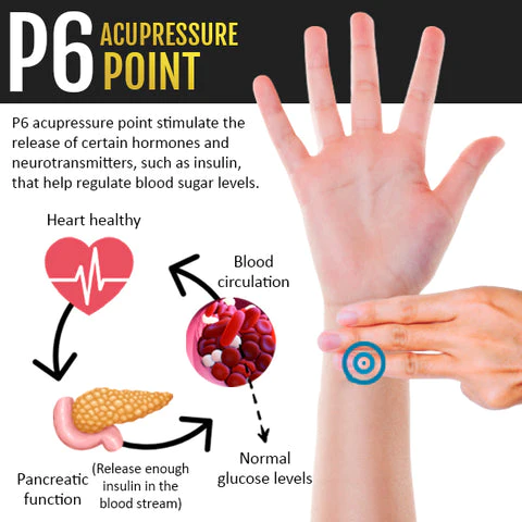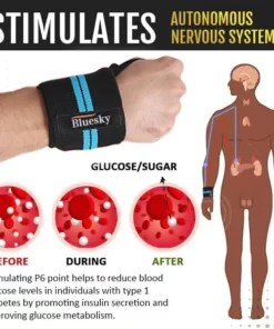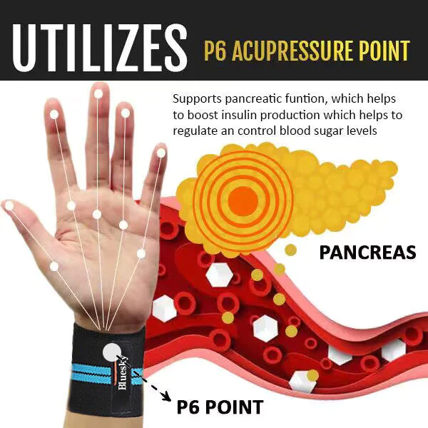The BLUESKY™ Sugar Control Wristband works by targeting the P6 acupressure point on the wrist, which is known to help regulate blood sugar levels. The wristband is designed to apply gentle pressure to this specific acupressure point, which can help to stimulate the body’s natural ability to regulate glucose levels in the bloodstream.