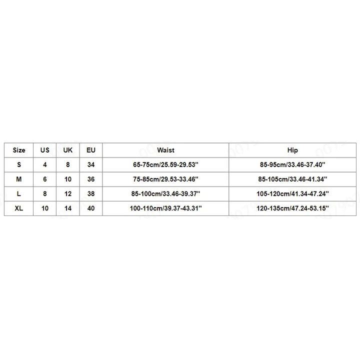 - Size US UK EU Waist Hip S 4 8 34 65-75cm/25.59-29.53” 85-95cm/33.46-37.40” M 6 10 36 75-85cm/29.53-33.46” 85-105cm/33.46-41.34” L 8 12 38 85-100cm/33.46-39.37” 105-120cm/41.34-47.24” XL 10 14 40 100-110cm/39.37-43.31” 120-135cm/47.24-53.15”