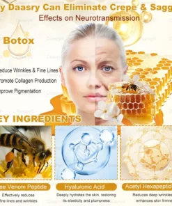 Daasry® Bee venom Comprehensive Cream uses bee venom peptides to mimic the effects of Botox, relaxing facial muscles and reducing the formation of expression lines. At the same time, hyaluronic acid deeply hydrates the skin, making it plump and effectively smoothing fine lines and wrinkles. The combination of Acetyl Hexapeptide-8 and botulinum toxin targets deep wrinkles like forehead lines and crow’s feet, leaving your skin looking firmer and smoother.