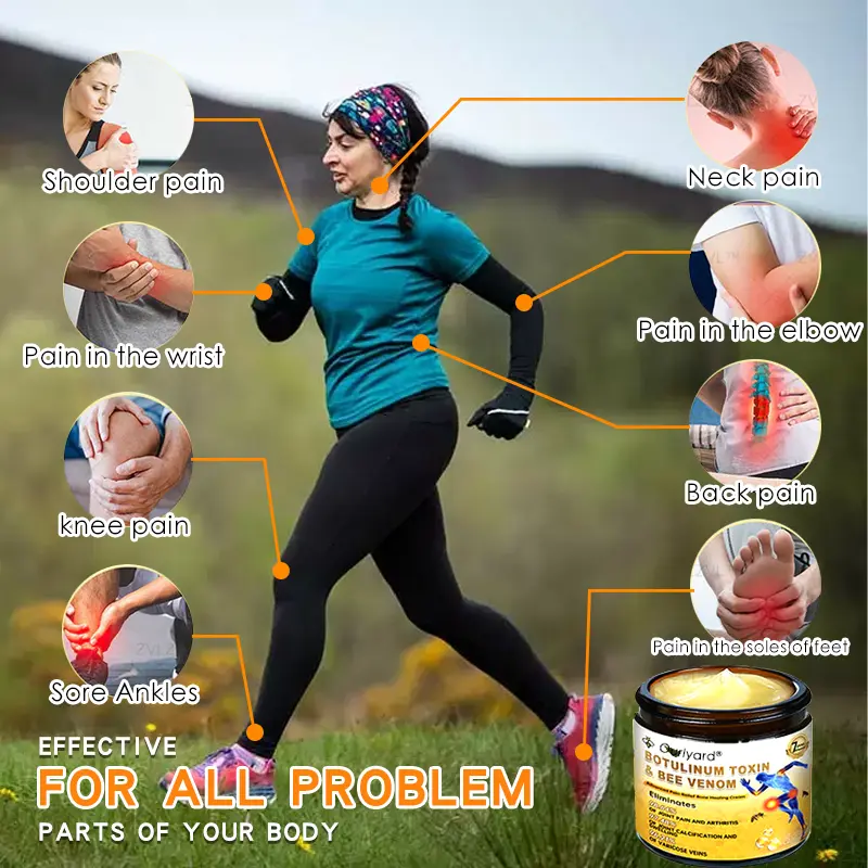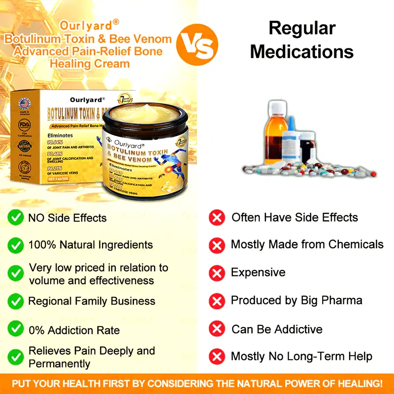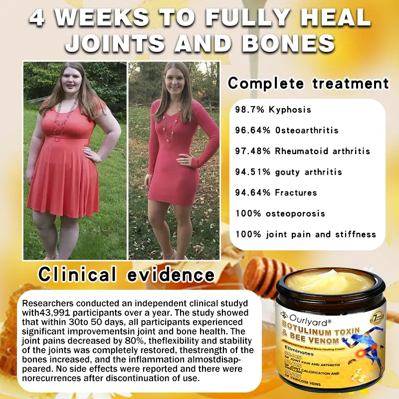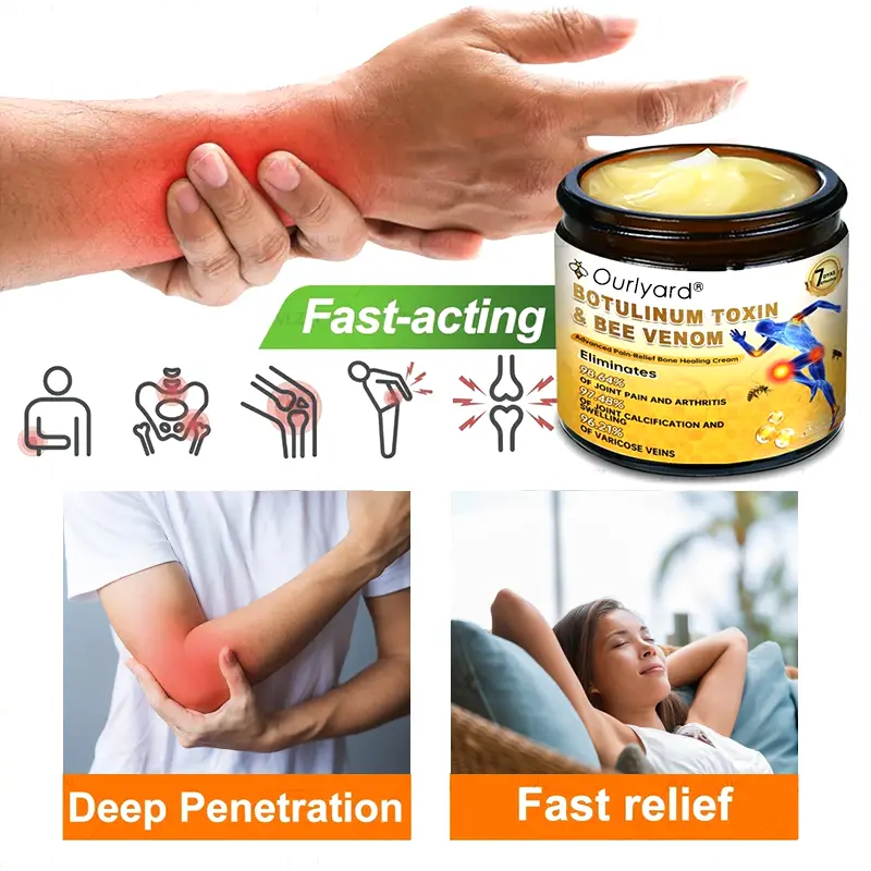 Choose Ourlyardยฎ Botulinum Toxin & Bee Venom Pain-Relief Bone Healing Cream with absolute confidence. Backed by rigorous scientific research and trusted by orthopedic experts, this innovative formula combines the power of Botulinum Toxin and Bee Venom to deliver exceptional results. Whether you’re dealing with joint discomfort, stiffness, or arthritis symptoms, this cream is designed to provide fast, effective, and lasting relief.