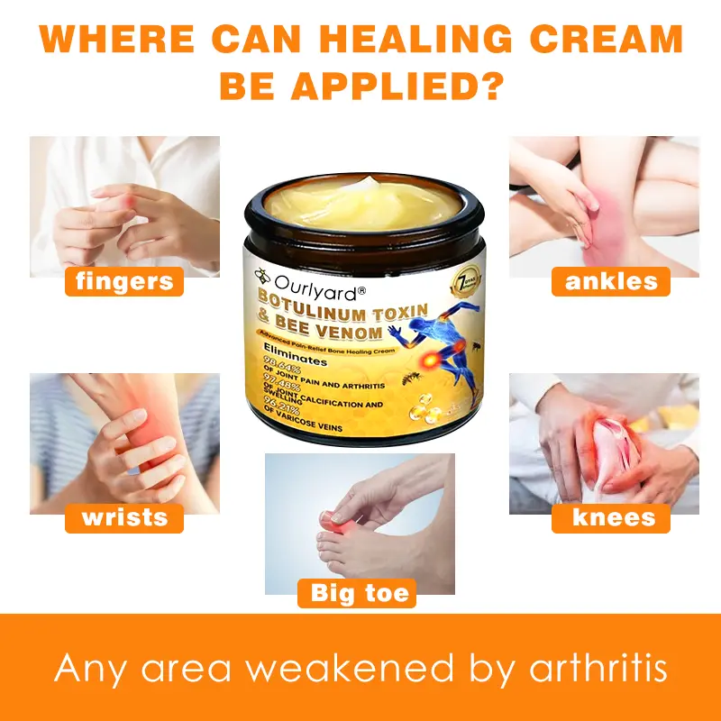 As an orthopedic specialist, I strongly recommend Ourlyardยฎย Botox & Bee Venom Pain Relief & Bone Healing Dual Action Soothing Cream for patients dealing with osteoarthritis, rheumatoid arthritis, and other inflammatory joint or bone conditions. This advanced cream is formulated with powerful active ingredients such as botulinum toxin, bee venom extract, glucosamine, and chondroitin, which work together to effectively reduce inflammation, nourish joints, and improve mobility.Additionally, it supports the restoration and repair of cartilage and bone tissue, alleviates pain and stiffness, and eliminates harmful crystal deposits that may accumulate in the joints. These combined benefits help enhance joint function, offering a comprehensive and effective solution for managing joint-related conditions.