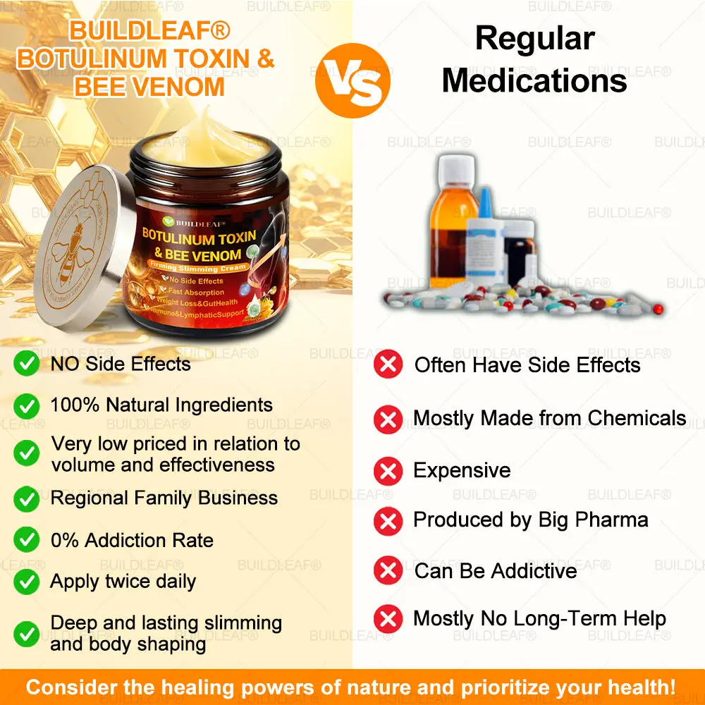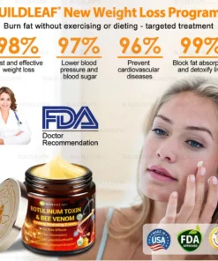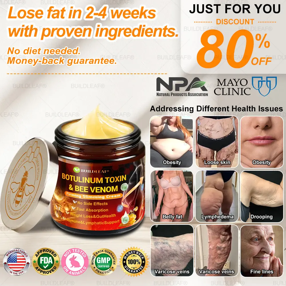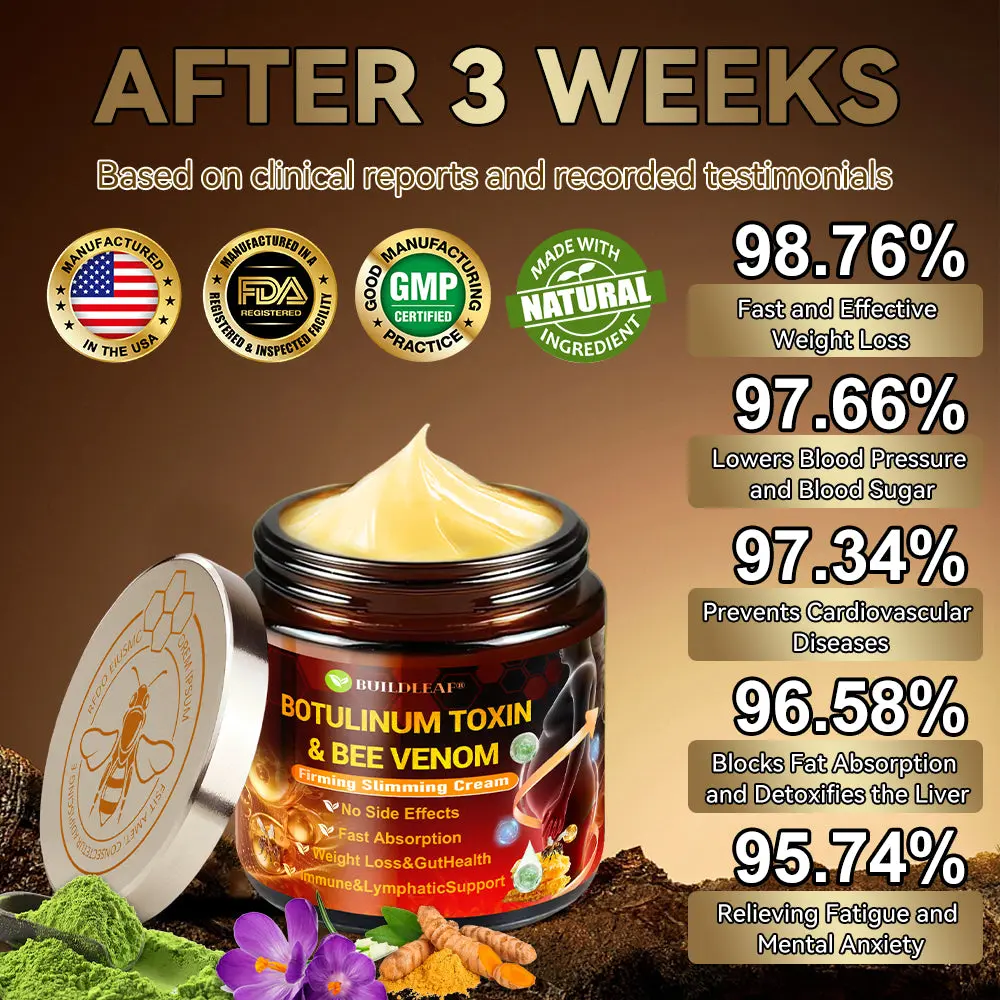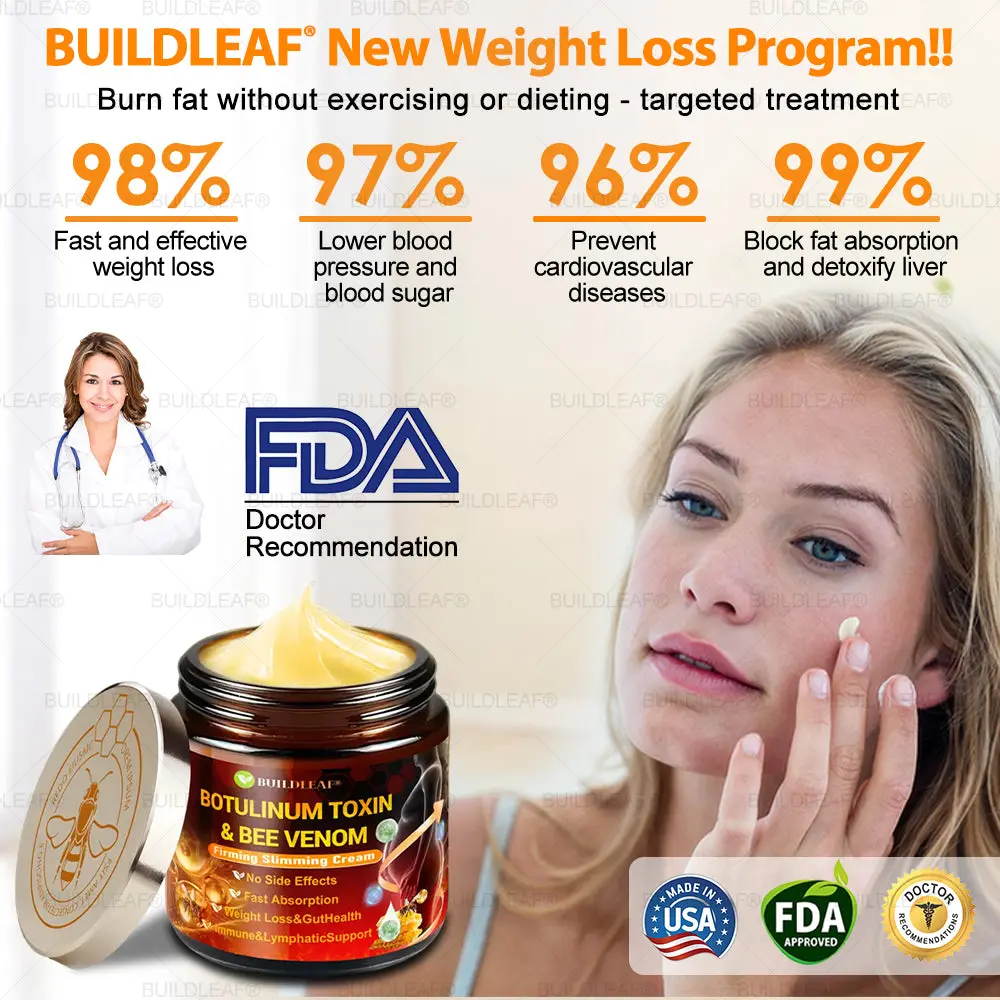 BuildLeaf® Botulinum Toxin & Bee Venom Slimming Cream is a groundbreaking formula developed by a team of over 30 metabolic health experts at the Mayo Clinic, based on more than 20 years of clinical research. This innovative cream combines medical-grade botulinum toxin, bioactive bee venom, and potent herbal extracts to boost metabolic rate, accelerate fat breakdown, and support the healthy function of both the digestive and lymphatic systems.Approved by the FDA, it offers a safe, effective, and scientifically backed solution for weight management and overall wellness.