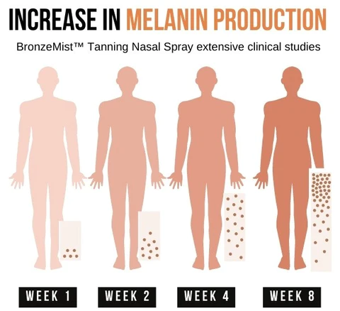 BronzeMist™ Tanning Nasal Spray uses biomimetic technology to stimulate the production of melanin, the pigment responsible for giving your skin its color. Melanin is naturally produced in response to UV exposure, but BronzeMist™ Tanning Nasal Spray triggers the same process without the need for harmful UV rays. Simply spray it into your nose and let the formula do the rest.