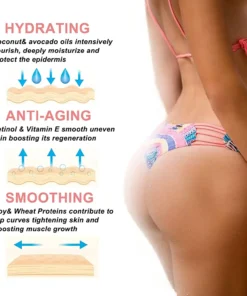 ButtUP LiftPlump Massage Cream helps increase skin metabolism, activate the sleeping cells in the buttocks, reduce cellulite and tighten the skin around the butt area, it will firm, plump, and lift your buttocks. Improve flabbily, sagging, and flat buttocks, effectively shaping the hip line. Deeply improve moisture retention of the skin in the buttocks and hip area for a smoother skin surface that glows from the inside out.