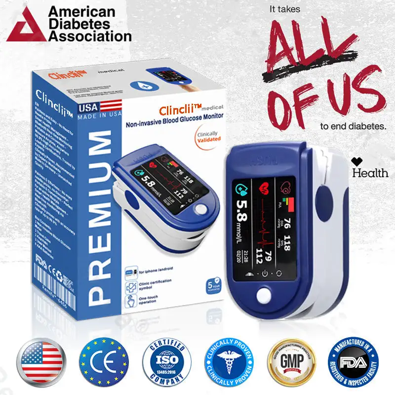 Choose Clincliiโขย Non-Invasive Blood Glucose Monitor. supported by ADA. FDA. IEC. and UL certifications. for reliable health management!