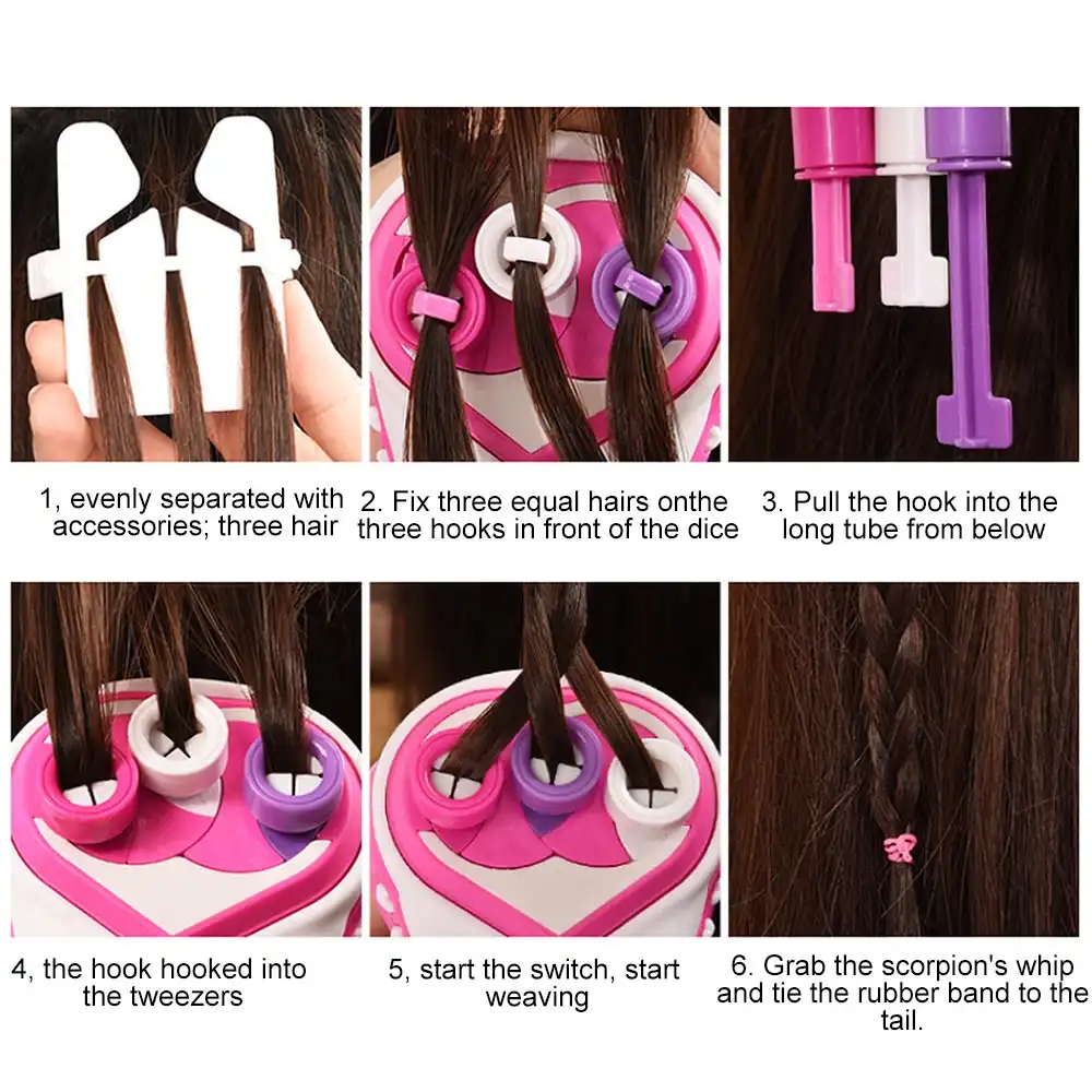 With this automatic hair braid tool, only 6 simple steps.Steps:01 evenly separate with accessories, three strands of hair; 02 fix three equal hairs on the three hooks in front of the braid; 03 pull the hook into the long tube from below; 04 hair hook into the hook of the braid; 05 starts the switch, start Braid; 06 Grab the braided whip and tie the rubber band to the tail just fine.