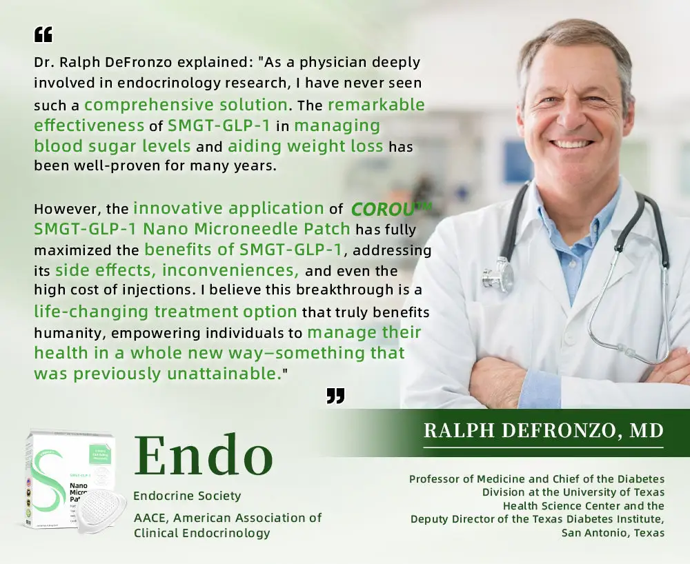 “I suffer from both obesity and diabetes. and I’ve been getting SMGT-GLP-1 treatment at the hospital. You might be wondering why I suddenly switched to using the COROU™ Microneedle Patch. SMGT-GLP-1. also known as semaglutide. is definitely a great treatment. It works really fast—just a short time after injection. my appetite dropped. I lost weight quickly. and my blood sugar went down. But. as we all know. it’s tough to break old habits. On my scheduled injection days. I’d come up with all sorts of excuses to skip. which led to failed treatments. The cost. hunger. time conflicts. or even something as simple as it raining outside would keep me from going. But the Microneedle Patch is perfect for someone like me who struggles with inertia. I can use it easily at home. and the effects last. keeping my appetite in check. What’s even better is that it’s really affordable. and anyone can use SMGT-GLP-1 to help lose weight and keep their blood sugar in check!”
